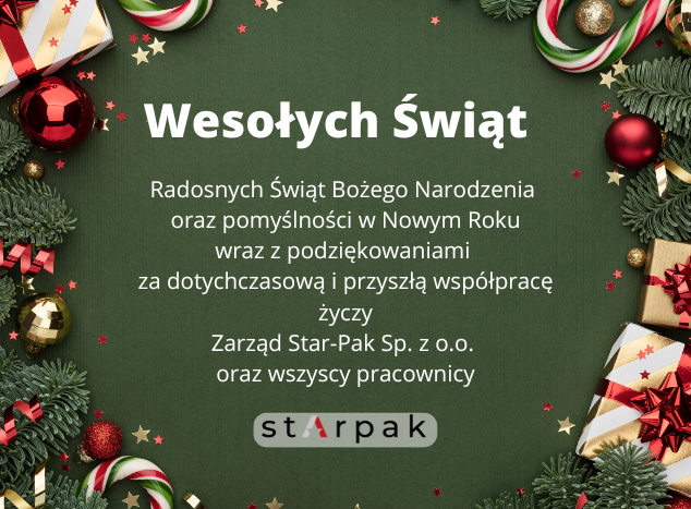 Firma Star–Pak Sp. z o.o. została założona w 1994 roku. W ciągu kilku lat dzięki dynamicznemu rozwojowi staliśmy się wiodącą firmą dystrybucyjną w branży opakowań, materiałów opakowaniowych i maszyn na rynku polskim. Zapraszamy do współpracy